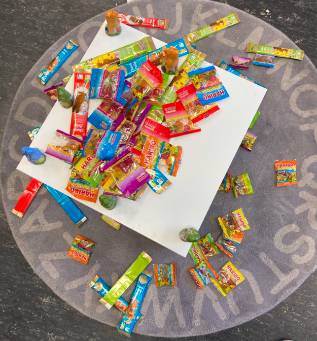 Der Osterhase kam zu Besuch, und die Waschbären sollten alle 100 Eier finden. Als Belohnung fanden die Kinder Schoko-Lollis und Gummibärchen in der Klasse.