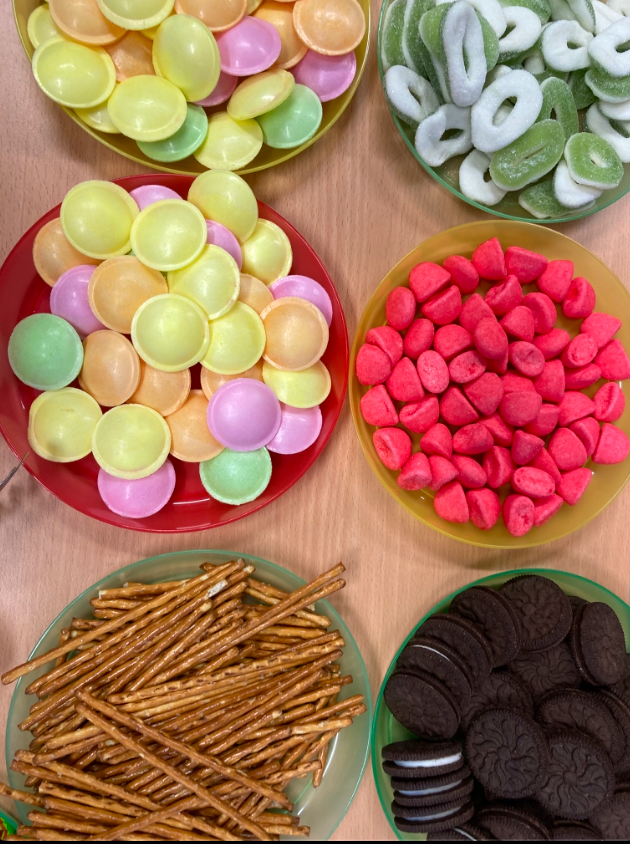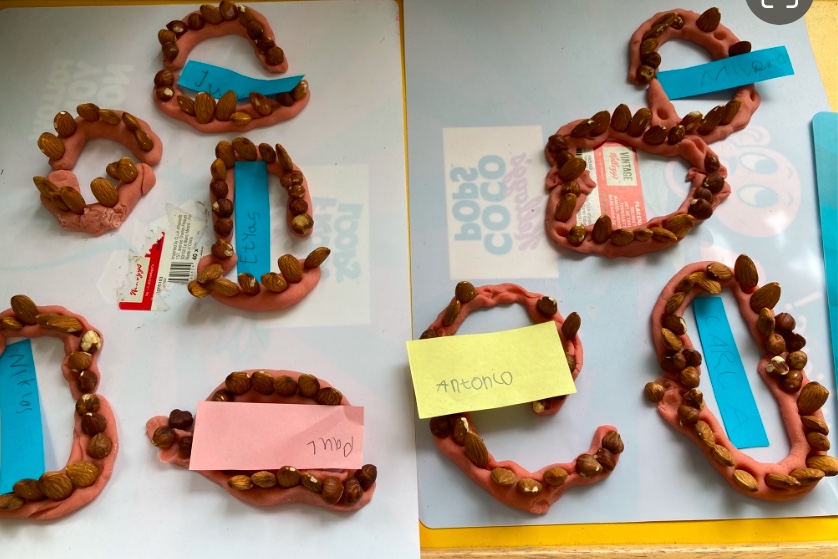 Im Sachunterricht haben die Waschbären einiges über ihre Zähne gelernt. Sie sollten auch ihre Gebisse aus Knete, Mandeln (für Schneidezähne) und Haselnüssen (für Eckzähne) bauen.
