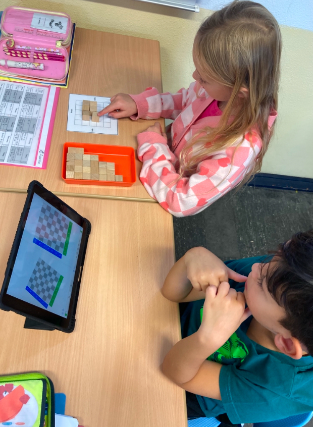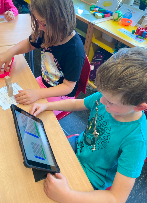 In Mathematik haben die Waschbären zu dem Thema „Würfelgebäude“ gearbeitet. In den letzten Stunden haben sie außerdem mit der „Potzklotz-App“ Würfelgebäude gebaut.