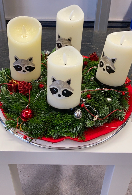 Die Weihnachtszeit hat uns der schöne Adventskranz verschönert. Natürlich waren auf den Kerzen Waschbären drauf.